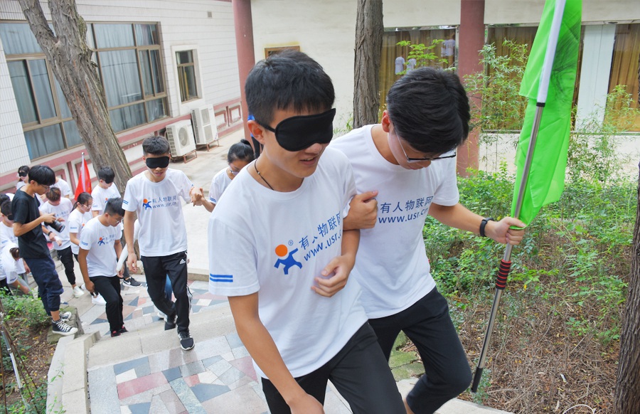 规则:一人戴上“眼罩”扮演“盲人”,一人扮演“聋哑人”,两人为伴,相扶前行。