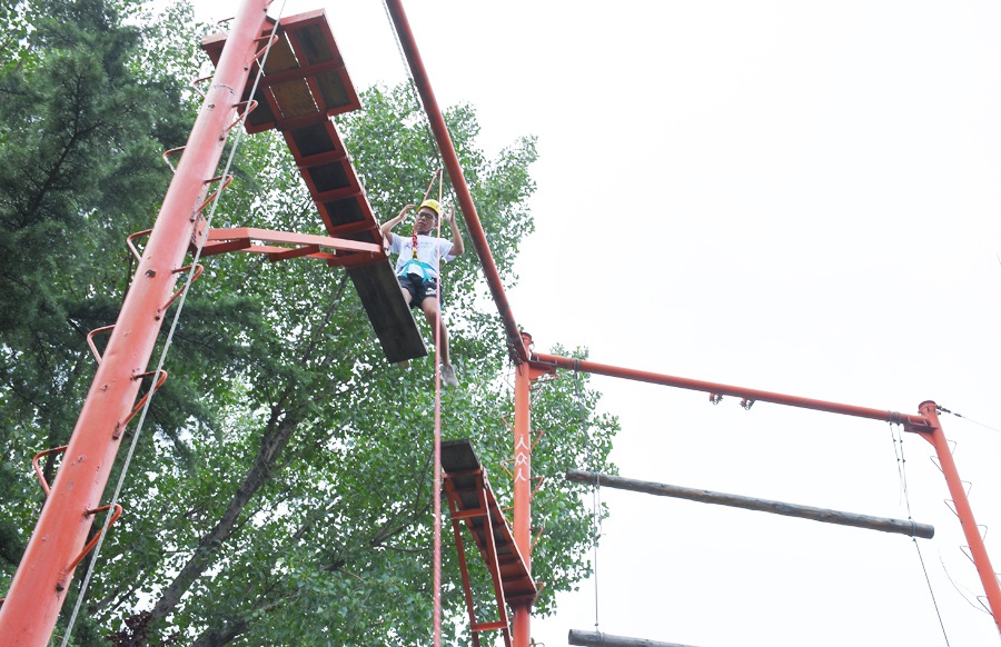 规则:在距离地面8米的高空之上,利用钢结构与木板搭起一座“中间断开、间距达1.2-1.4米”的独木桥,需要一鼓作气快速通过。