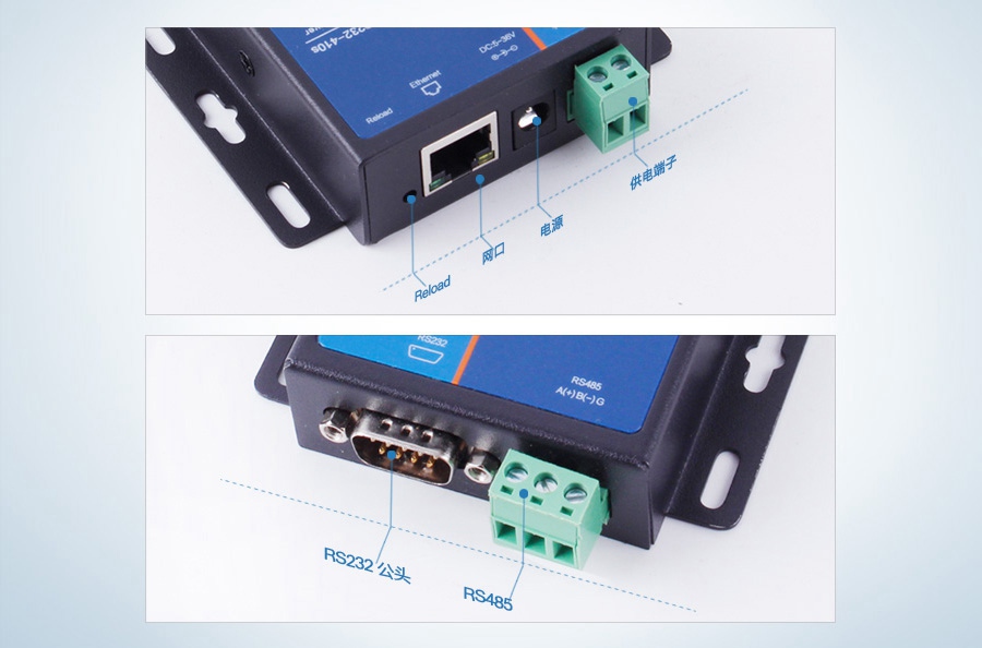 串口服务器:串口终端设备连接串口服务器RS232/485/422对应的串口进行通讯,将数据信息传输到远程服务器上。