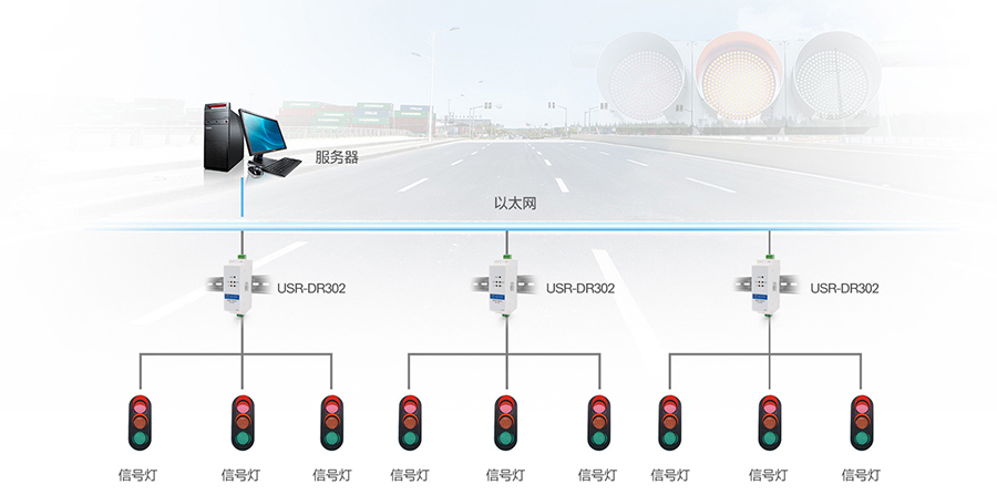 联博士RS485串口服务器连接交通信号灯,将交通路况信息送上网络端,控制室人员可根据 现场情况快速做出交通调度和规划。