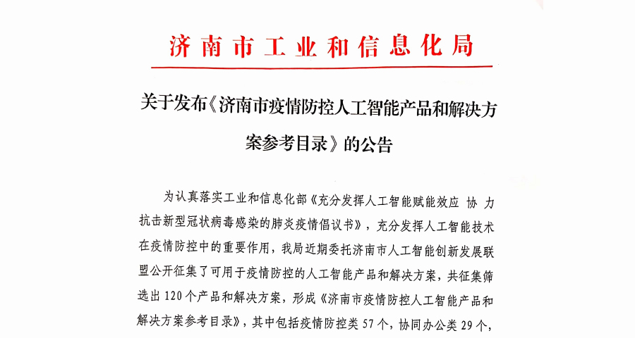 昨日,济南市工业和信息化局印发“关于发布《济南市疫情防控人工智能产品和解决方案参考目录的公告》”,有人物联网旗下云服务产品“有人云”入选该目录。