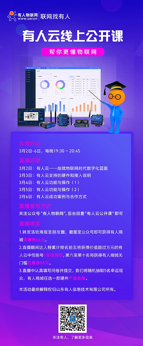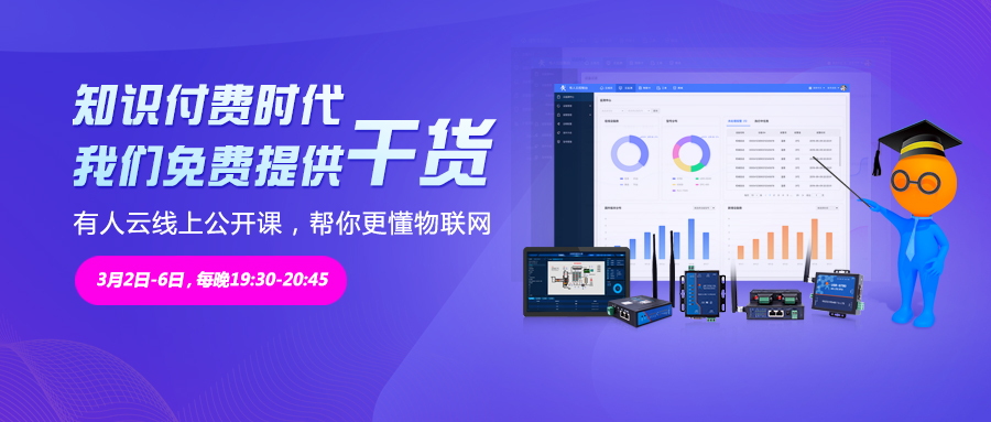 3月2日-6日、每天19点30-20点45,我们正式推出“有人云线上公开课”,特邀有人物联网CIO、软件事业部总监王伟携一众技术、销售精英,为大家详解有人云产品知识,帮助大家选择一个好的、合适的物联网云平台。