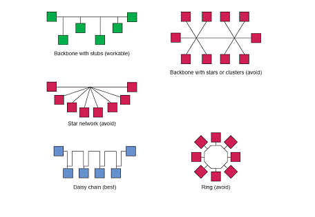 几种类型的网络拓扑都是可能的,但是菊花链总线配置是最有效的。通常,单元之一是控制网络流量的主机,并防止多个驱动程序同时处于活动状态(总线争用)。屏蔽双绞线电缆是物理介质。电缆阻抗应在100-120的范围。在采用双头螺栓技术的骨干网中,不得在设备端断开任何双头螺栓的连接。否则,这种螺柱将充当天线,并在RS485总线上引入大量噪声,以至于把通讯的可能变得不可能。这实际上是一个相当普遍的问题根源。 电缆越长,数据速率越低:
