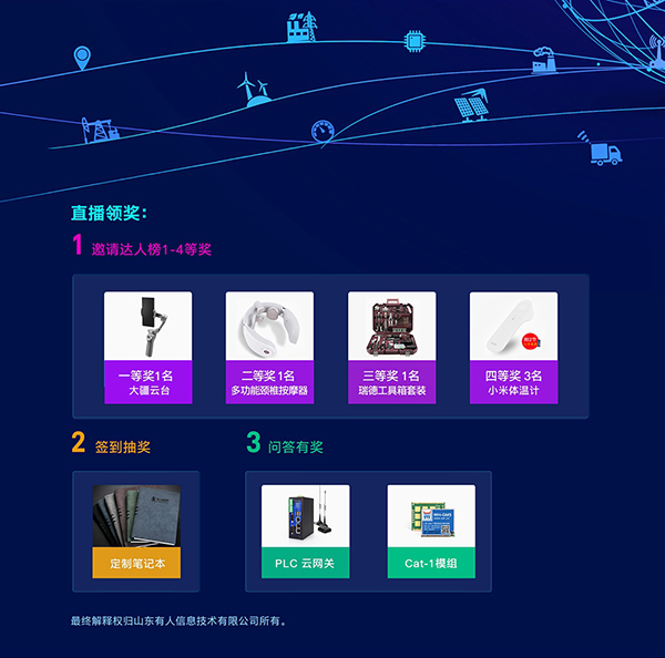本次直播,有人物联网特邀公司云服务、智能硬件等相关产品负责人,为大家提供“智能硬件上云服务”、“智能方案展示”、“5G/Cat-1/NB-IoT新品介绍”等干货;同时,直播期间参与互动,还会有好礼相送,欢迎大家参加。