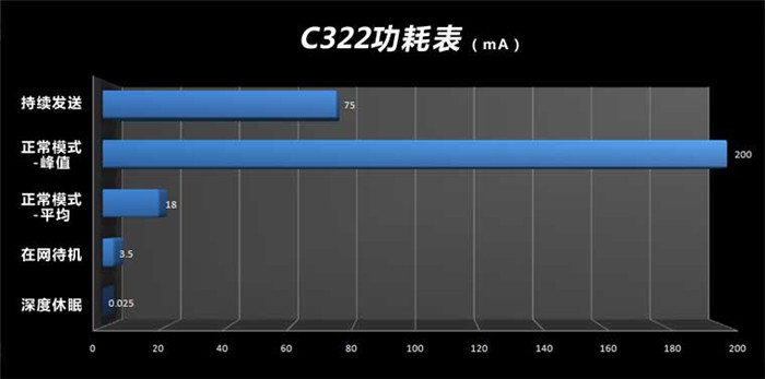 功耗一直是影响WIFI模块推广的限制因素之一,在此之前最低功耗的是有人的USR-WIFI232-T,在网待机最低功耗12mA,而C322在功耗控制上更加优秀,根据应用情况支持5种功耗模式,在网待机最低功耗仅3.5mA,深度休眠甚至低至25uA,功耗控制可谓业界最高水准了。 |