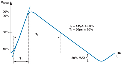 在浪涌测试期间,五个正脉冲和五个负脉冲被施加到数据端口,每个脉冲之间的最大时间间隔为一分钟。该标准规定,应在测试期间将设备设置在正常操作条件下。