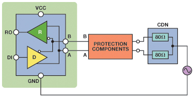 电阻将浪涌瞬变耦合到通信线路上。上图显示了半双工RS-485设备的耦合网络。电阻的总并联总和为40。对于半双工设备,每个电阻为80。