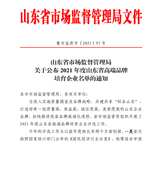 为深入实施质量强省及品牌战略,共建共享“好品山东”,打造培育一批质量高、效益高、诚信度高、美誉度高的山东企业品牌,加快推进我省品牌高端化进程,省市场监管局组织开展了2021年度山东省高端品牌培育企业评选工作。