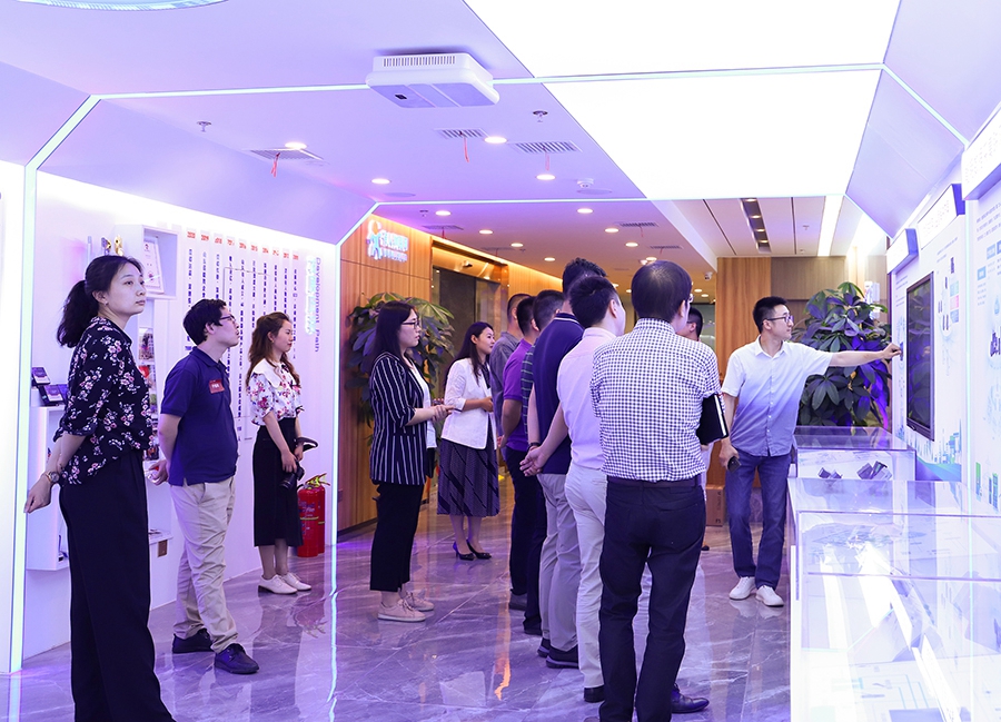 参观公司现代化展厅时,集团战略总监、爱物联总经理王伟向校友一行演示了公司在工业水处理、能源数据采集、智慧停车、智慧农业、智慧畜牧业等领域成功落地的解决方案案例。校友一行对有人物联网在联网通讯领域的业绩赞不绝口。