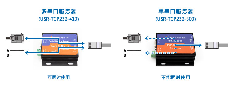 串口服务器分为单串口服务器和多串口服务器,“有人”的T24系列为单串口方案(-300典型,485和232二选一,不能同时使用),M4系列为多串口方案(-410典型,485和232可同时使用)。 |