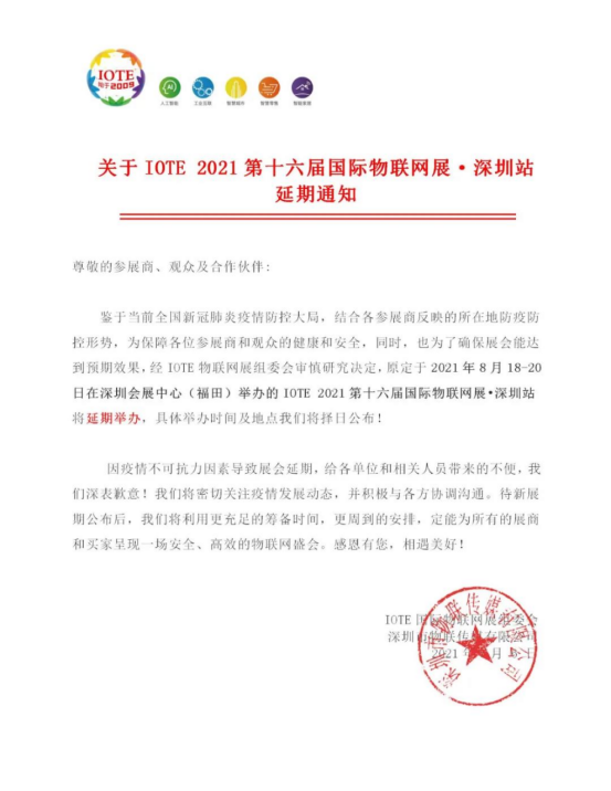 关于IOTE 2021 第十六届国际物联网展·深圳站延期通知