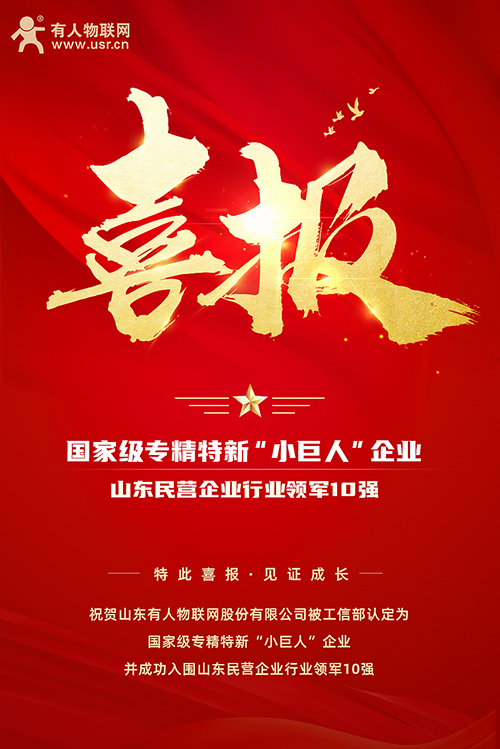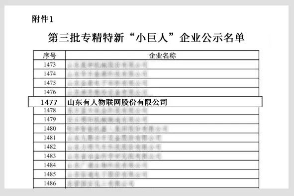 近期,工业和信息化部公示了第三批国家级专精特新“小巨人”企业名单,山东有人物联网股份有限公司被工信部认定为国家级专精特新“小巨人”企业。