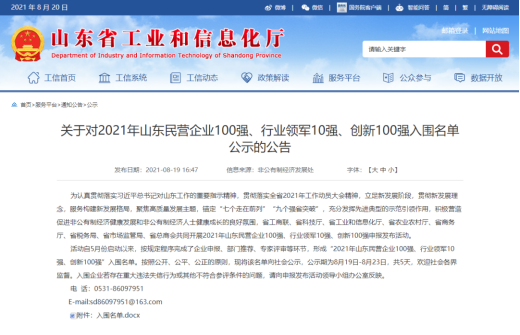 19日,山东省工信厅发布了关于对2021年山东民营企业100强、行业领军10强、创新100强入围名单公示的公告,山东有人物联网股份有限公司成功入围山东民营企业行业领军10强!