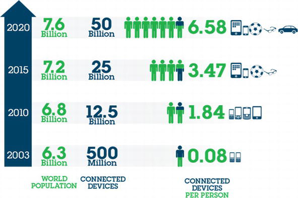 使用物联网的主要思想是拥有一个智能系统并连接全球数十亿台设备。预计到 2020 年,通过物联网设备连接在一起的设备预计将达到 500 亿。下图显示了到 2020 年世界人口和连接设备的增长情况。连接如此庞大数量的设备需要高安全级别以防止诈骗并允许高水平的数据保护。因此,要获得行业和个人所需的信任以利用物联网共享他们的数据,实现高水平的安全性是一项巨大的挑战。