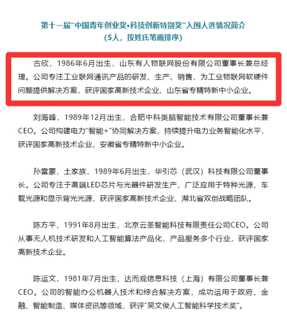 喜报|有人物联网创始人古欣入围第十一届“中国青年创业奖•科技创新特别奖”评选名单