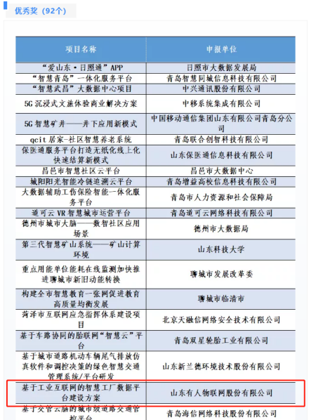 近日,由国家信息中心指导,山东省大数据局主办的第一届新型智慧城市大赛颁奖仪式在青岛市完美收官。有人物联网申请的基于物联网化的智慧农业监测解决方案、综合商务楼宇物业设备管理智能化改造解决方案和基于工业互联网的智慧工厂数据平台建设方案在全国20个省、48个市的2000个参赛项目,突出重围,三次上榜第一届中国新型智慧城市创新应用大赛•兴业赛道获奖名单,分别获二等奖“智优奖”、三等奖“智佳奖”、优秀奖“智成奖”。这极大程度彰显了有人物联网在数字产业化、产业数字化方面的解决方案的高推广价值和高商业价值,展示了有人物联网在智慧城市建设方面的卓越能力和强大实力。
