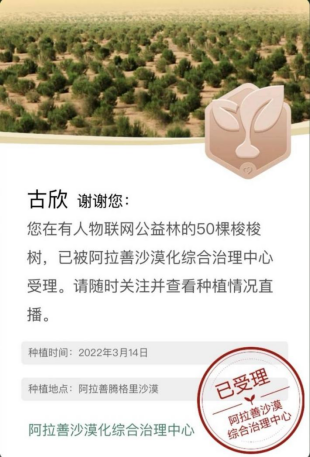 近日,在第44个植树节来临之际,由山东省自然资源厅指导,山东省互联网传媒主办的“在益起·蓝天责任”云植树行动启动。有人物联网董事长古欣带领并号召全体员工积极参与此次云端植树活动,通过云端认养树苗、线下专人种植养护,建造有人物联网公益林,助力阿拉善沙漠筑起绿色屏障、生命防线,守护我们的碧海蓝天。