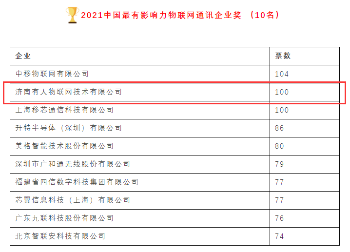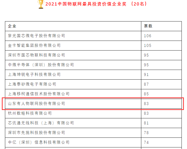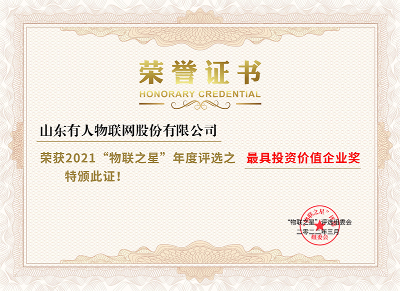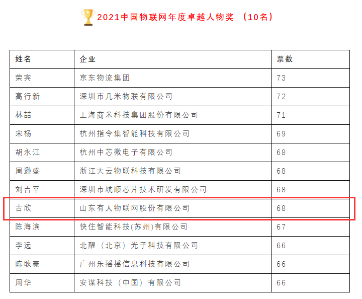 2022年3月16日,“2021年物联之星”中国物联网产业年度评选结果正式揭晓。本届“物联之星”评选自启动以来吸引了超500家物联网全产业链上的优秀企业参与,共有800余名行业专家评委参与投票。最终,有人物联网董事长古欣获2021年度物联网年度卓越人物奖,有人物联网获2021年度最具有投资价值企业奖、2021年度最有影响力物联网通讯企业奖。