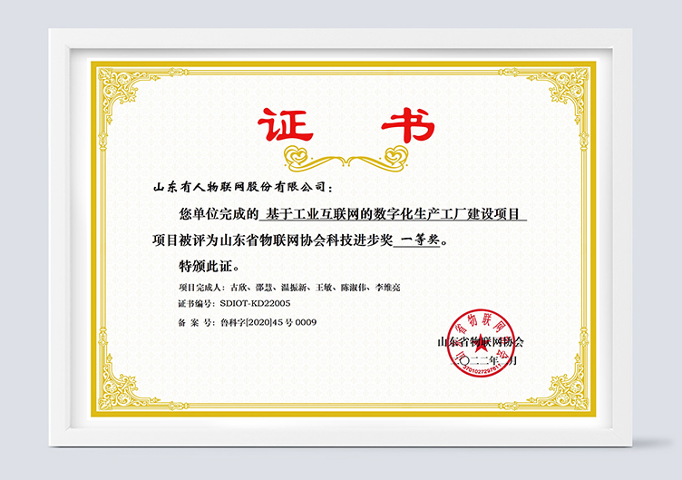 凭借在项目科学性、创造性、先进性等方面的综合表现,有人物联网“基于工业互联网的数字化生产工厂建设项目”荣获山东省物联网协会科技进步奖一等奖。