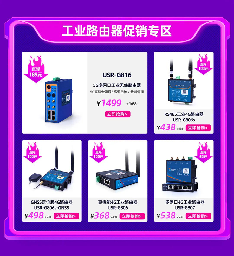 重点产品讲解:新品USR-G805c重磅上市,关注直播间了解产品详情,并参与1元秒杀活动。USR-M100、USR-G817两款新品预告,工业路由器、DTU、串口服务器、LoRa、工控等将依次登场,我们带你玩转产品,秒到产品。