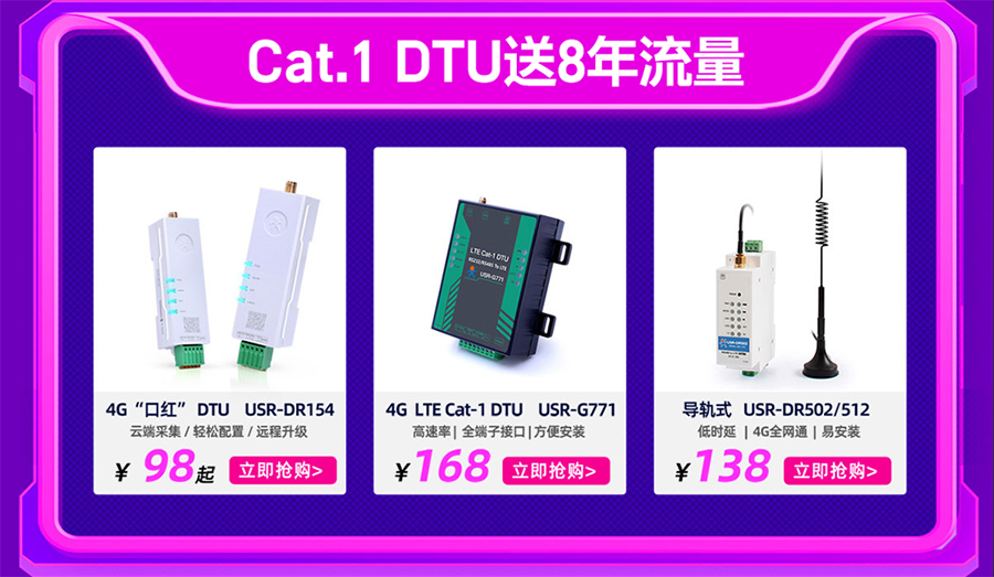 多款产品1元秒:四次秒杀环节(3点、3点半、4点半、5点),5G工业路由器、Cat.1DTU 、串口服务器、4G 工业路由器,价值千元产品一元到手!