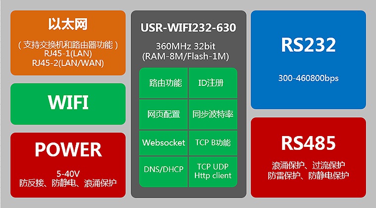 630网络功能接口支持“WIFI”和“双以太网口”,双网口支持路由功能,串口功能接口支持“RS232”和“RS485”任意选择一种(但不支持同时使用)。630不仅可以实现232/485转WIFI、232/485转以太网,甚至可以实现以太网与WIFI的双向数据透传。