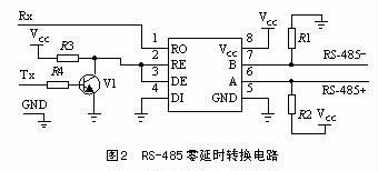当不发送数据时,TTL电平的Tx信号为高电平,经V1反向为低电平,RS-485芯片处于接收状态。