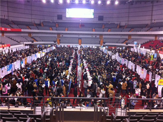 2016年3月26日,山东省济南市,山东大学中心校区体育馆内举行毕业生招聘会,673家用人单位提供万余个就业岗位,吸引了1万多名毕业生前来寻找工作。