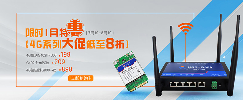 4G无线路由器USR-G800价格直降100元,价格为898元。如此大幅降价,跌破行业底价,怎能不让人心动!