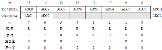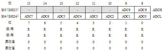 A/D转换结束后(ADIF = 1),在ADC数据寄存器(ADCL和ADCH)中可以取得转换的结果。对于单端输入的A/D转换,其转换结果为: