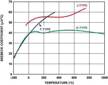 图3.热电偶灵敏度随温度而变化注意,从0°C至1000°C,K型塞贝克系数大致恒定在约 41 µV/°C