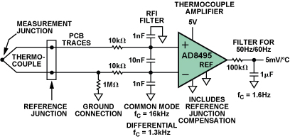 因为电压信号微弱,信号调理电路一般需要约100左右的增益,这是相当简单的信号调理。更棘手的事情是如何识别实际信号和热电偶引线上的拾取噪声。热电偶引线较长,经常穿过电气噪声密集环境。引线上的噪声可轻松淹没微小的热电偶信号。