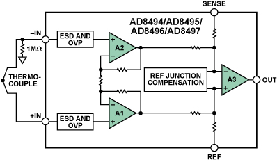 AD8495的更多详情:图7所示为AD8495热电偶放大器的框图。放大器A1、A2和A3(及所示电阻)一道形成一个仪表放大器,它使用恰好产生5 mV/°C输出电压的一个增益来对K型热电偶输出进行放大。在标记“Ref junction compensation”(参考接合点补偿)的框内是一个环境温度传感器。在测量接合点温度保持稳定的条件下,如果参考接合点温度由于任何原因而上升,来自热电偶的差分电压就会降低。如果微型封装的(3.2 mm × 3.2 mm × 1.2 mm)AD8495接近参考接合点的热区域,参考接合点补偿电路将额外电压施加到放大器内,这样输出电压保持恒定,从而对参考温度变化进行补偿。
