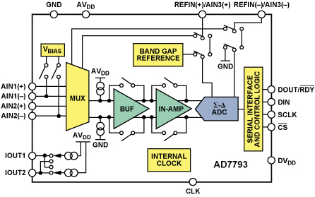 消除噪声并放大电压:AD7793如图9所示,使用AD7793—一种高精度、低功耗模拟前端来测量热电偶电压。热电偶输出经过外部滤波后连接到一组差分输入AIN1(+)和AIN1(–)。信号然后依次经过一个多路复用器、一个缓冲器和一个仪表放大器(放大热电偶小信号)发送到一个ADC,它将该信号转换为数字信号。