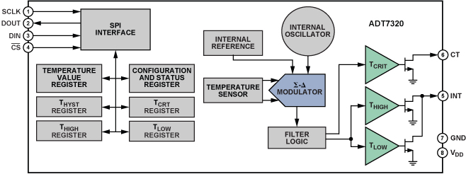 校正非线性度:ADT7320在整个额定温度范围(–40°C至+125°C)内呈现出色的线性度,不需要用户校正或校准。因而其数字输出可视为参考接合点状态的精确表示。