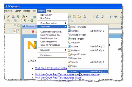 LPCXpresso IDE基于Eclipse IDE框架,在Eclipse文档中有很多内核特征的详细描述,在帮助菜单中可以发现这些帮助文件。更多的用户文档可以到Code Red的网站上获得。4.1 LPCXpresso的桌面布局 LPCXpresso桌面包含很多窗口,每一个窗口分别显示LPCXpresso环境一个特定的详细数据,因而被称为观察窗口,这些数据可以是源代码、hex数据、反汇编、存储器内容等等。观察窗口可以打开、移动、固定、关闭,并且当前的窗口布局可以保存和恢复。一个特殊的窗口配置称之为“透视图”。在LPCXpresso中,无论代码编写还是调试都在一个界面下进行。这种方式使得开发工作变得简单和高效。所有的观察窗口都可以随意拖动。如果一个观察窗口被无意关闭了,可以从“Show View”对话框中再次打开。“Show View”对话框可以从“Window”---“Show View”---“other”中打开,如下图所示。