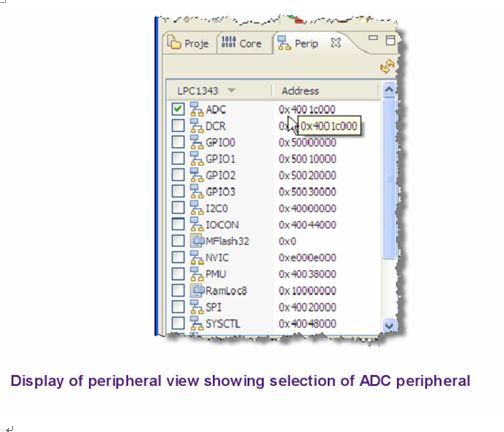4.1.2.1 外设观察窗口 LPCXpresso IDE有一个包含所有外设的注释、交互式调试观察窗口。可以通过标签项选择寄存器观察窗口或者外设观察窗口。外设被选中后,会在控制台观察窗口显示“memory”观察窗口。分别如下图所示。