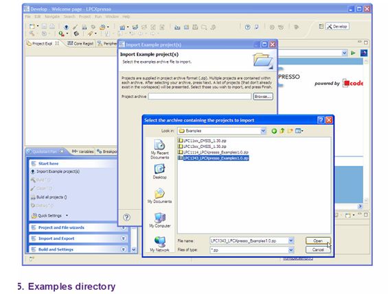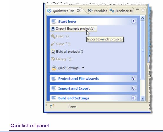 l 在快速启动面板中,单击“Start Here”,然后选择”Import Example project(s)“。如下图所示。l 在弹出的页面中,从“Browse”中选择例程所在的目录。根据提示打开例程即可。如下图。