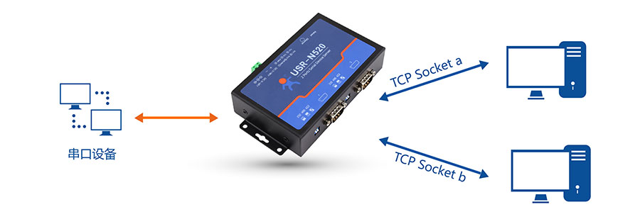 串口服务器同时监听端口,将所有接收的数据转发给串口设备。