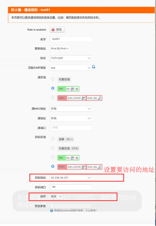 第三步,为新建的规则进行命名,然后在“目标地址”中选择需要限制上网的IP地址,“动作”命令中选择“接受”,最后点击“保存”。
