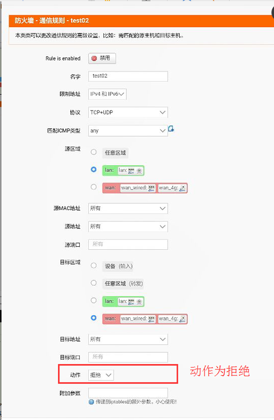 第四步,再次新建一个规则,用于屏蔽互联网网站,“动作”命令中选择“拒绝”,目标地址和MAC地址选择“所有”,然后进行保存,并重启生效。