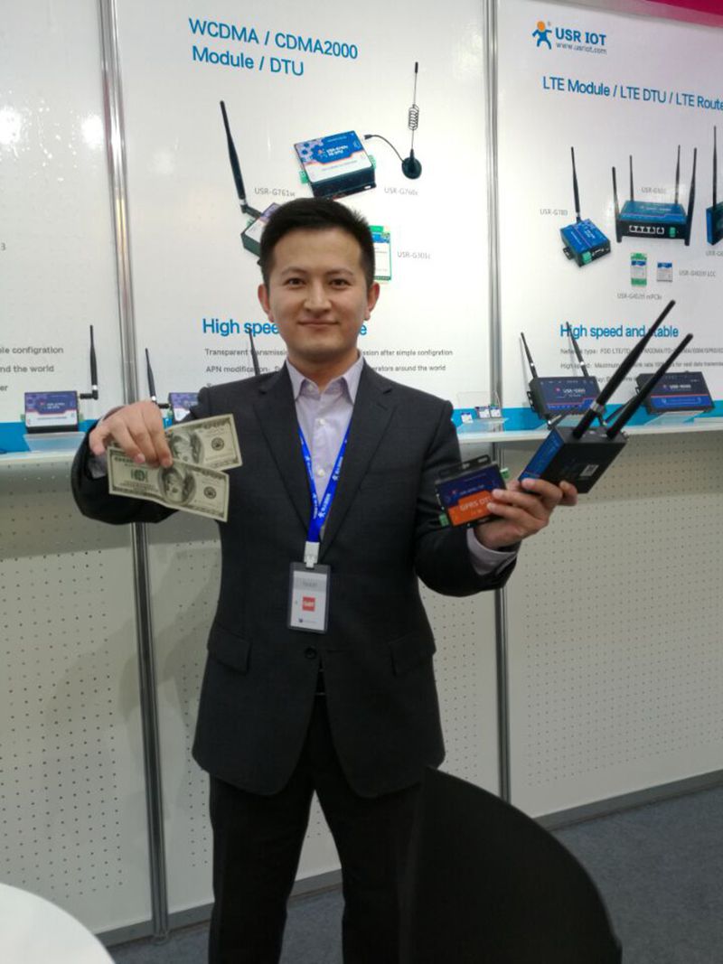 我们的销售副总手持顾客已购买的GPRS DTU和4G工业路由器