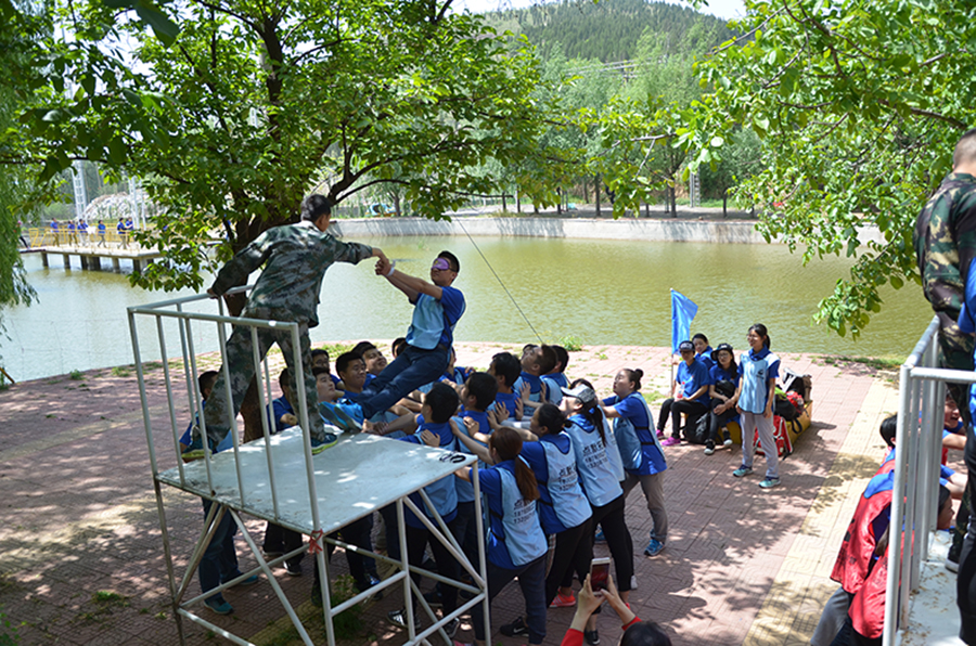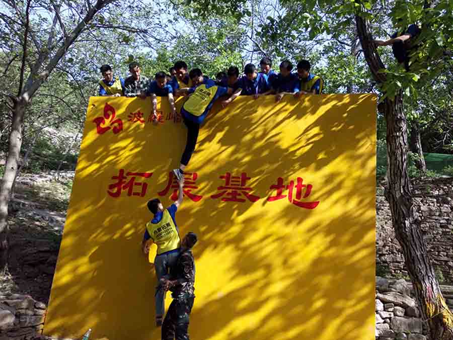 要求全队所有成员在规定的时间内翻越一面高4.26米的光滑墙面,在此过程中,大家不能借助任何外界的工具,所能用的资源只有每个人的身体。
