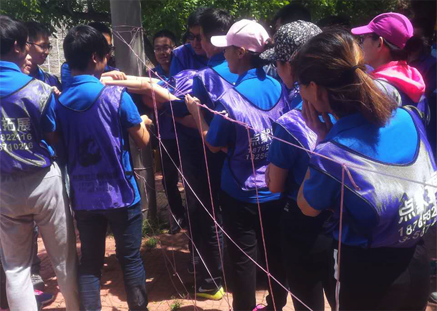 每位队员都需要穿越一张与地面垂直的“电网”(绳网),网上的一个洞就是一条生路,但每条生路都只能使用一次。身体的任何部分,都不许碰到绳子的边缘,碰到即为“触电”。