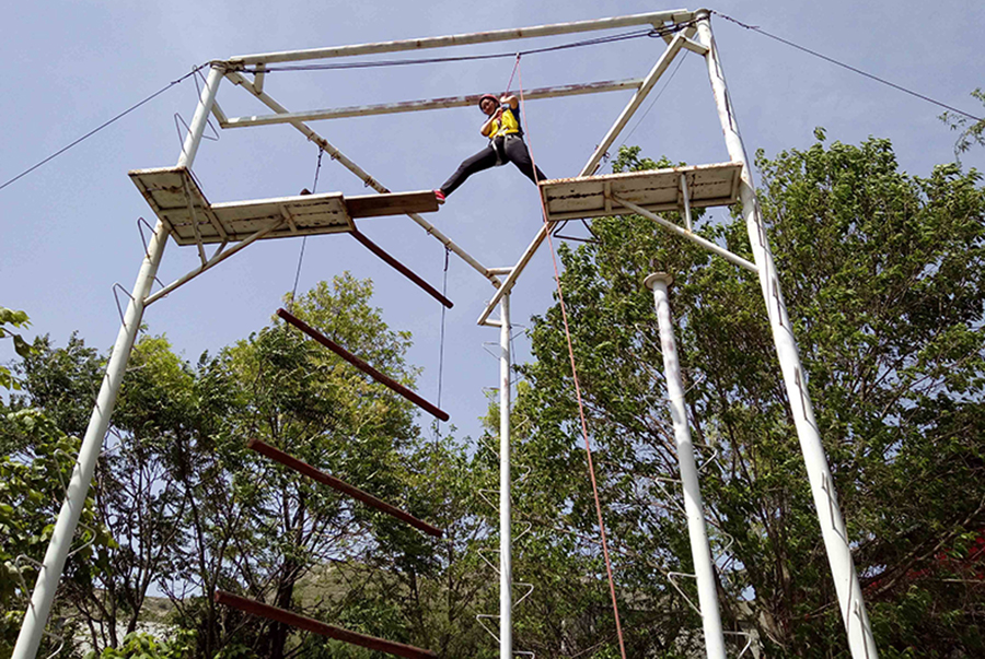 在距离地面8米的高空搭起了一座独木桥,桥的中间断开1.2米-1.4米。要求队员爬上8米的高空后,从一侧迈到另一侧,再从另一侧迈回来,队员要完成两次跨越...