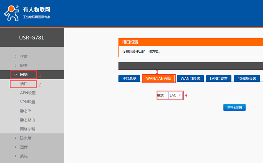 这种方式进行组网网时只需要进行一步设置即可达到该组网的要求,只需要在内置网页中将网口的WAN口工作模式改成LAN口,具体页面请参照上图。