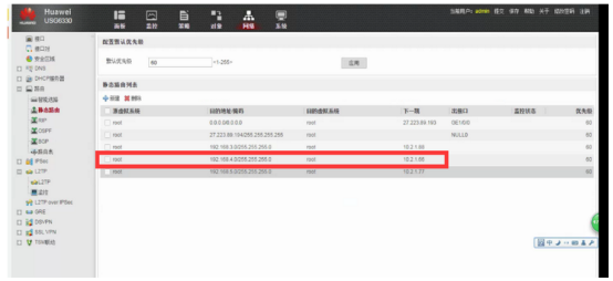 第二,设置华为路由器路由。华为路由器上增加静态路由0.0.0.0/0.0.0.0 27.223.89.193为路由器默认路由,192.168.4.0/255.255.255.0 10.2.1.66 为手动添加的路由。