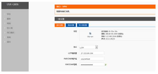 第三,设置USR-G806的VPN。设置VPN接口:网络---接口---添加接口。协议还是选择L2TP。然后设置相应的PAP/CHAP的用户名和密码。