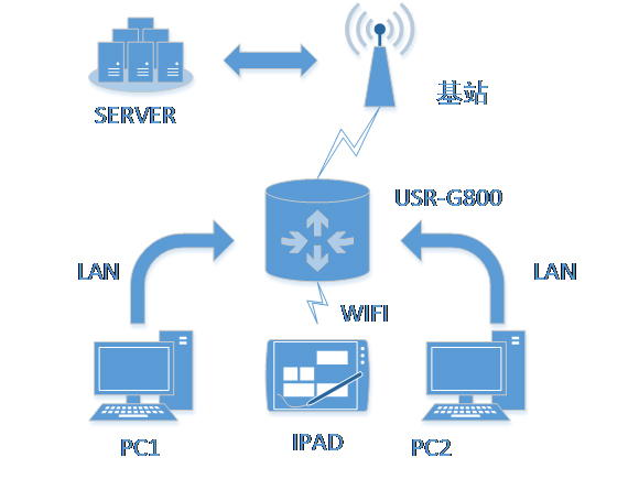 这样的组网方式下,路由器不需要进行任何设置,接上网线,插上拥有4G流量的SIM卡,给路由器供电即可。最大程度的减少了客户的设置过程,方便快捷。在这种组网方式下,路由器自带的WIFI的功能也可以同时工作,最大程度的增加用户的局域网的接入数量。