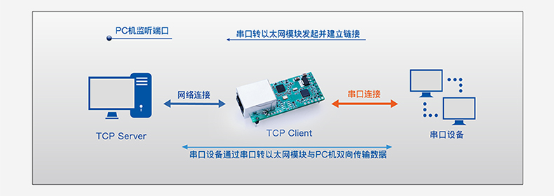 串口转以太网模块监听设定的端口并等待TCP客户端连接。